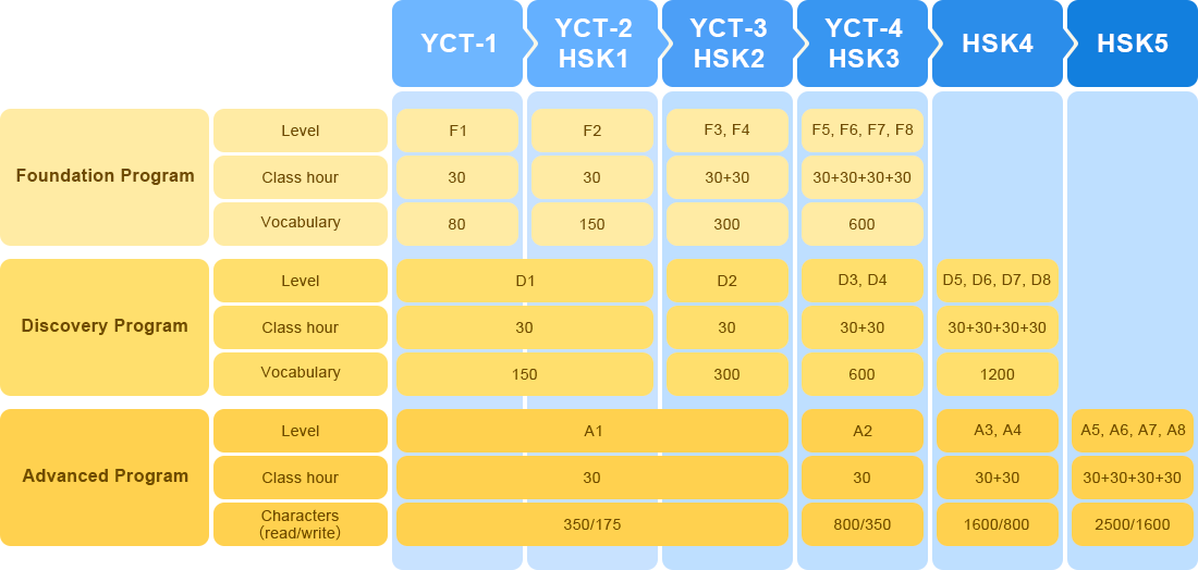 This program is aligned with globally recognized teaching and learning standards, e.g. ACTFL and YCT and HSK exam syllabus.